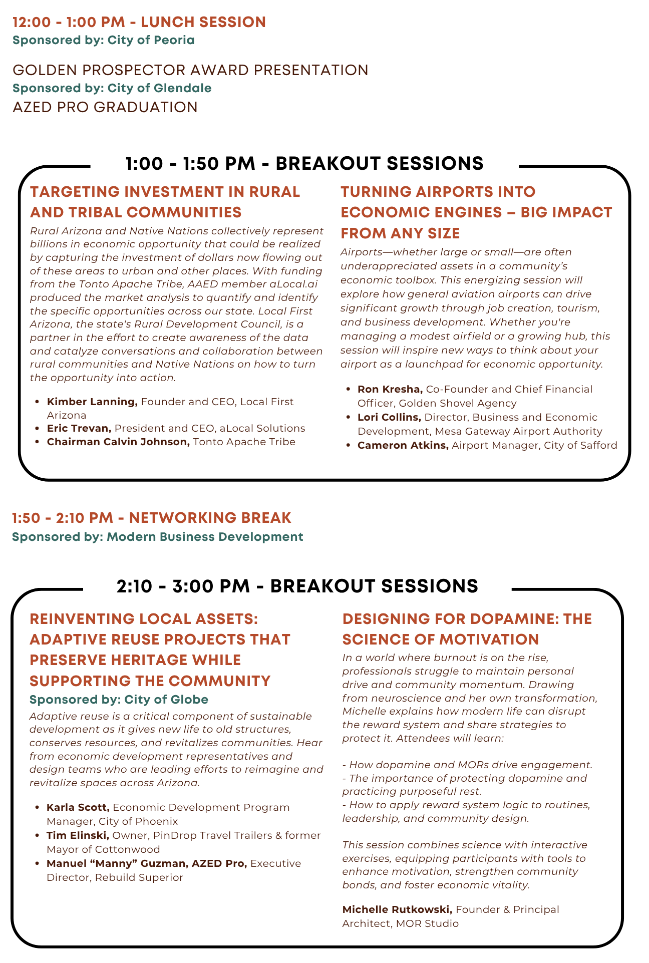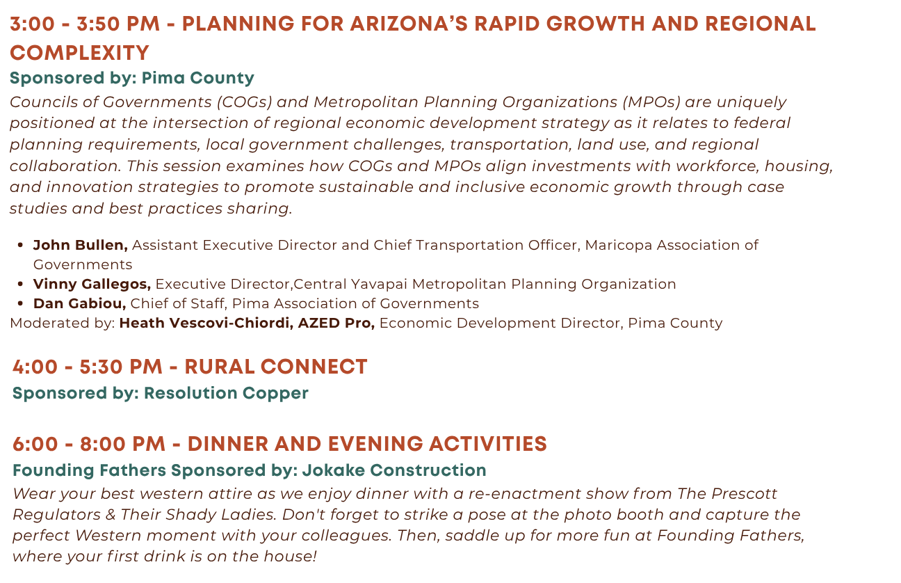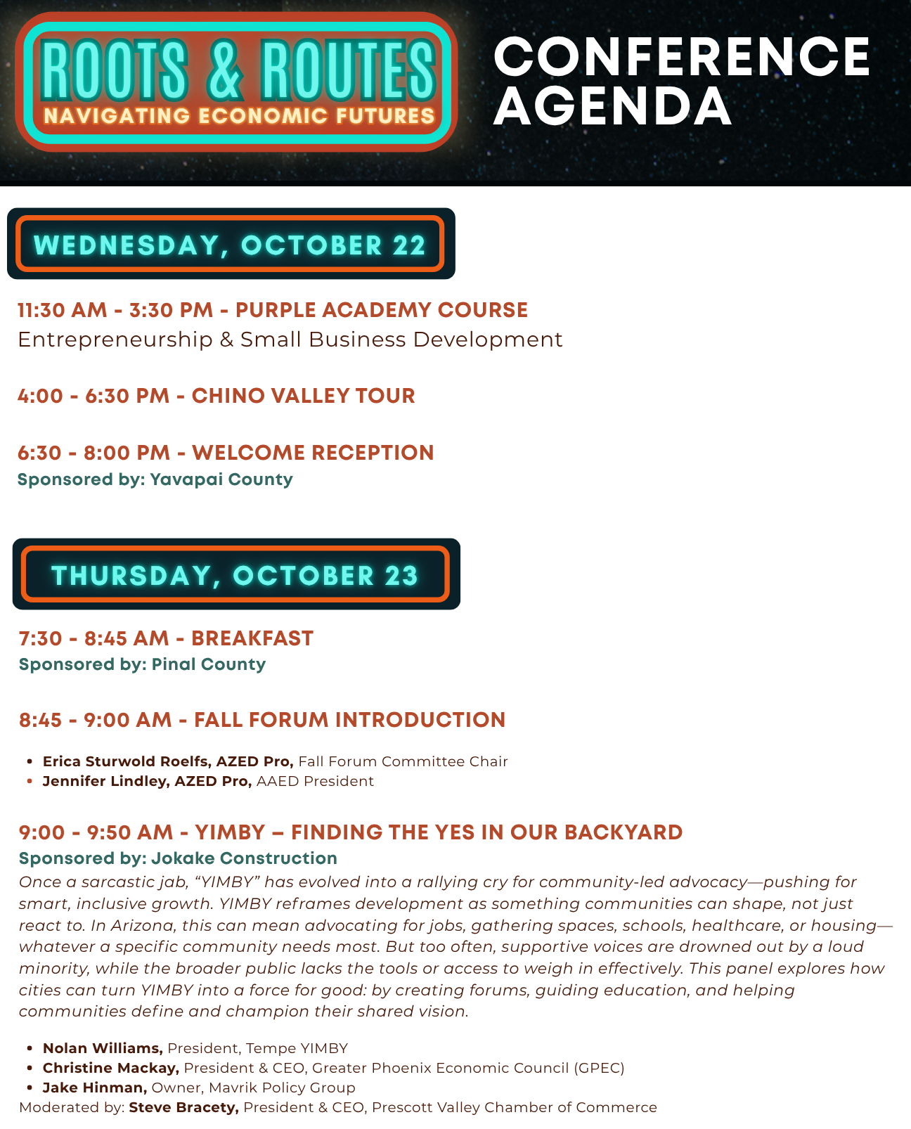 Explore powerful drivers of economic growth at the 2025 Fall Forum: Roots & Routes. From leveraging Foreign Direct Investment to maximizing the economic potential of our airports, you'll walk away with new tools and actionable insights to strengthen your community's future and innovate how we approach economic development in Arizona.